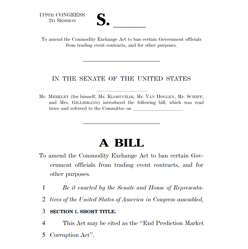 End Prediction Market Corruption Act。出典: Merkley.senate.gov