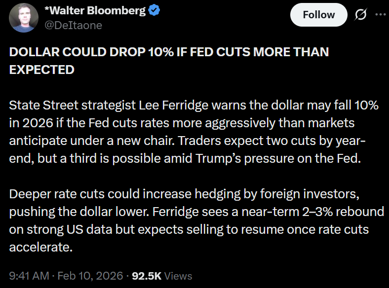 State Streetのストラテジストたちは、世界最大級の資産運用会社の1社として、米ドルの過去10年で最悪の時期が、連邦準備制度理事会(FRB)が市場の予想より積極的な政策緩和を行った場合に悪化する可能性があると指摘した。マイアミでのカンファレンスで講演したState Streetのストラテジスト、Lee Ferridge氏は、ドルが今年10%に達する下落を経験する可能性があると述べた。2回の利下げを合理的なベースシナリオと位置づけ、リスクがさらなる利下げに傾いていること、3回の利下げが可能であることを強調した。低金利はドル建て資産の魅力を低下させ、特に外国投資家がヘッジを通じてドルを売却するきっかけになる可能性がある。ドナルド・トランプがジェローム・パウエル議長の後任に提案したKevin Warshが議長に就任すれば、より積極的な利下げが予想される。市場はCME Group FedWatch Toolによると、現在の3.50-3.75%範囲から2回の利下げを織り込んでおり、最初のものは6月になる可能性がある。