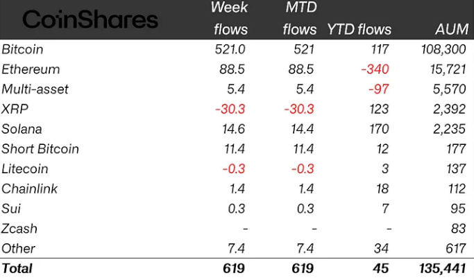 クリプトETPに619M$流入:BTC首位