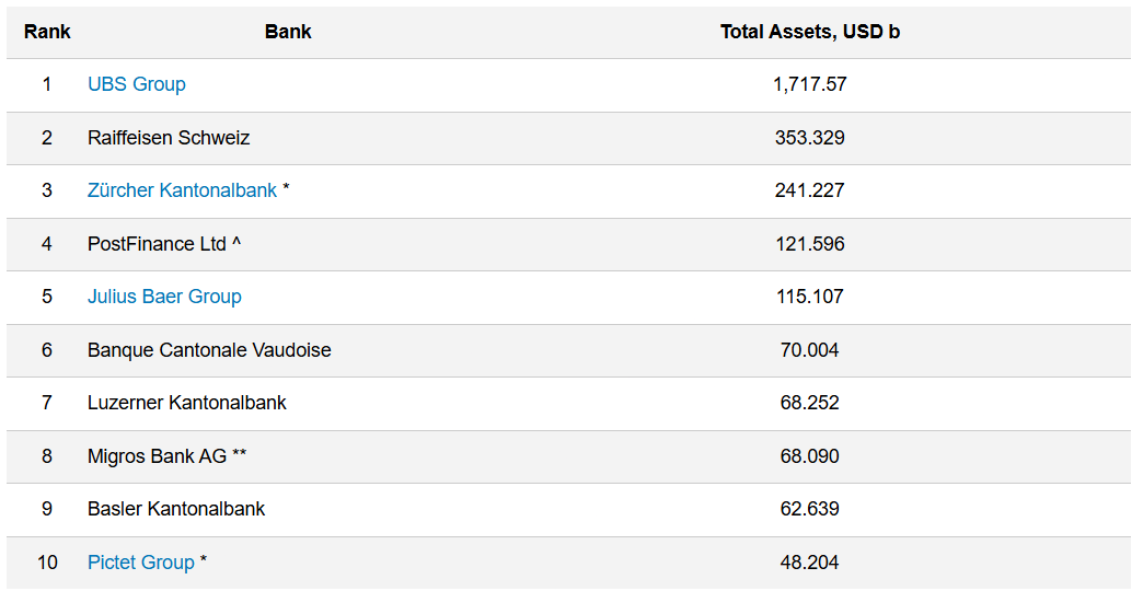 総資産によるスイス最大の銀行、USD、十億単位。出典: Advratings。